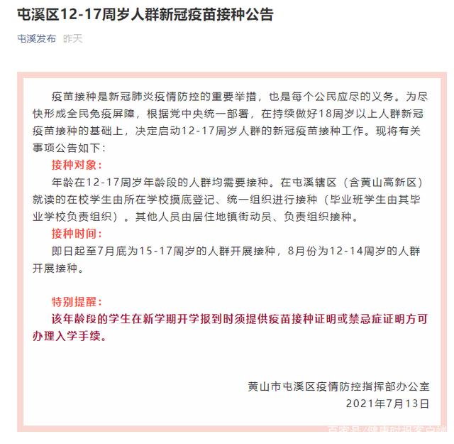 7月13日,安徽省黃山市屯溪區(qū)疫情防控指揮部發(fā)布《12-17周歲人群新冠疫苗接種公告》稱,決定啟動(dòng)12-17周歲人群的新冠疫苗接種工作,年齡在12-17周歲年齡段的人群均需要接種。該年齡段的學(xué)生在新學(xué)期開(kāi)學(xué)報(bào)到時(shí)須提供疫苗接種證明或禁忌癥證明方可辦理入學(xué)手續(xù)。
