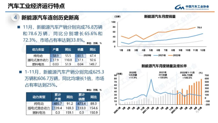 1-11月,新能源汽車產(chǎn)銷分別完成625.3萬輛和606.7萬輛,同比均增長1倍,市場占有率達(dá)到25%。其中純電動(dòng)汽車產(chǎn)銷分別完成485.7萬輛和473.4萬輛,同比分別增長91.2%和89.3%;插電式混合動(dòng)力汽車產(chǎn)銷分別完成139.4萬輛和133萬輛,同比分別增長169.3%和154.6%;燃料電池汽車產(chǎn)銷均完成0.3萬輛,同比分別增長159.1%和150.9%。